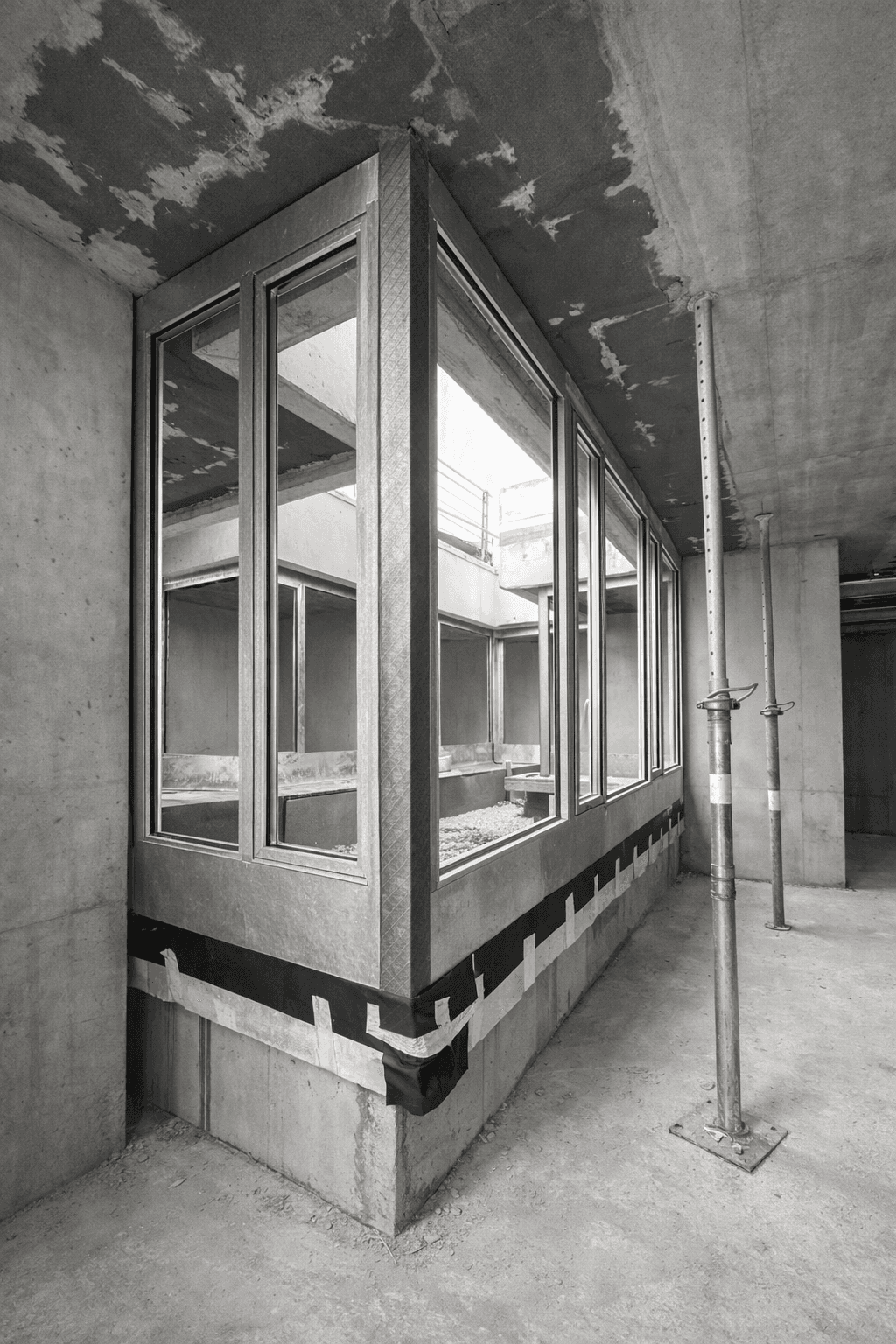 Projet mêlant sous-construction métallique, vitrages périphériques et détails de raccord, avec un travail précis sur les interfaces entre métal, verre et existant.